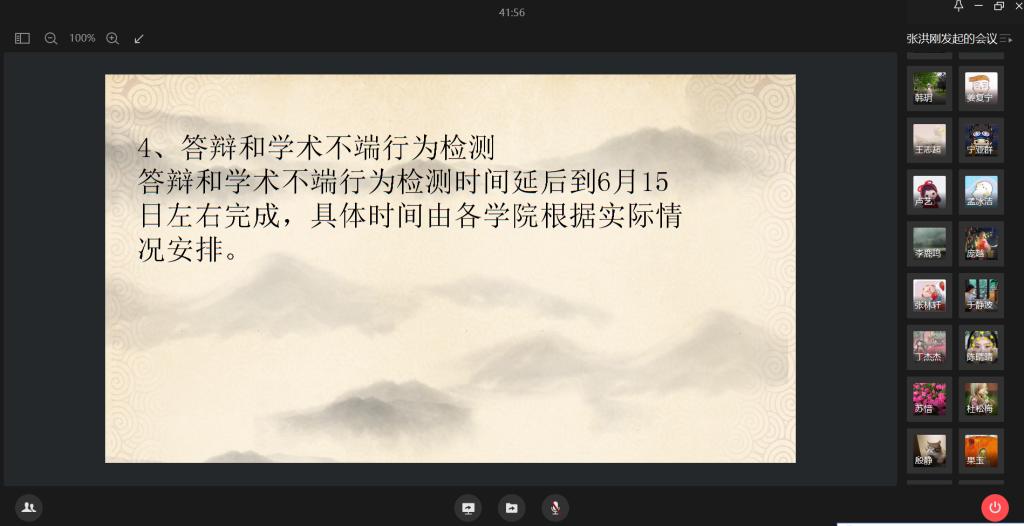 会议最后,研究生秘书对同学们提出的问题进行解答,并鼓励同学们居家做好防疫工作并专心撰写毕业论文,顺利毕业。