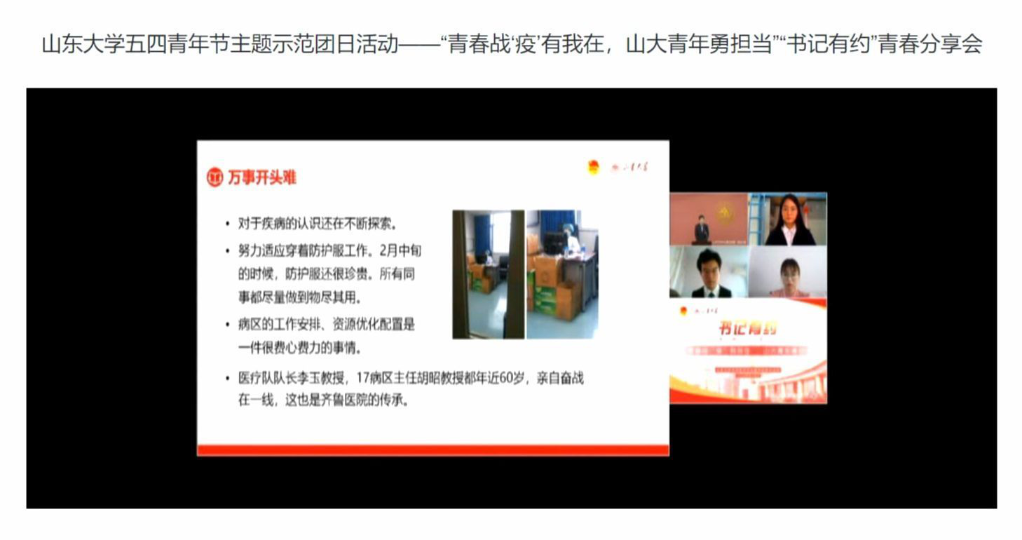 接着,来自公司各单位的9位青年师生及医务员工代表在会上畅谈学习体会,讲述了他们的战“疫”故事。三位援鄂医疗队青年代表,齐鲁医院重症医学科主管护师郭丙秀、齐鲁医院呼吸与危重症医学科主治医师季翔和第二医院重症医学科护师宋淳分享了他们亲赴前线,不惧危险,用自己的生命抵挡病毒蔓延的故事。三位青年教师代表展示了疫情期间投身学术和教育事业的成果:药学药物化学研究所副教授展鹏投身药物研发,国际教育公司副教授孙雪霄认真筹备线上教学,化学与化工公司团委书记张洁尽心尽力地服务员工。三位青年学子代表分享了自己的战“疫”经历与感受:留校的威海校区法公司硕士研究生李亚兰积极配合公司工作,有序安排在校的学习生活;来自湖北的政治学与公共管理公司硕士研究生孟鑫作为在鄂临时团支部成员,在公司师生的鼓励下,坚定信心,勇敢面对疫情,并表示期待早日回校与老师同学相见;参与志愿服务的外国语公司本科生马文啸,抗击疫情期间参与了诸多志愿服务活动,成为青年人的榜样。他们都是当代青年人勇敢担当的最好例证,展现了山大青年顾全大局、与国家同呼吸共命运的胸怀,以及新一代优秀青年学以致用、发挥己长、积极担当、贡献社会的精神。