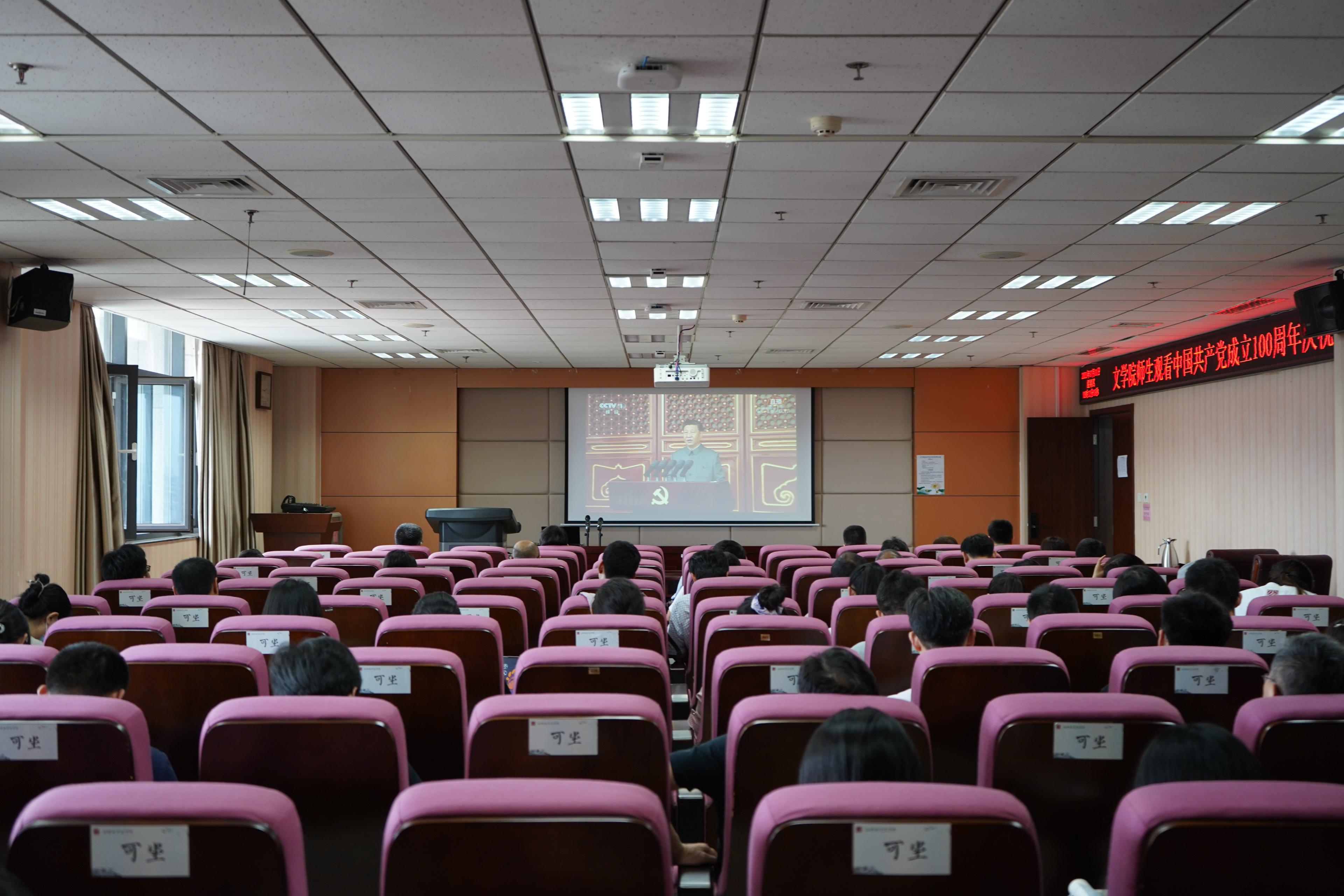 师生们早早来到报告厅,怀着激动的心情等待着大会的正式开始。在《没有共产党就没有新中国》的旋律中,大家感受百年大党走过的光辉历程,抒发对党的热爱和祝福,表达对祖国繁荣昌盛的美好祝愿。现场气氛热烈欢快。