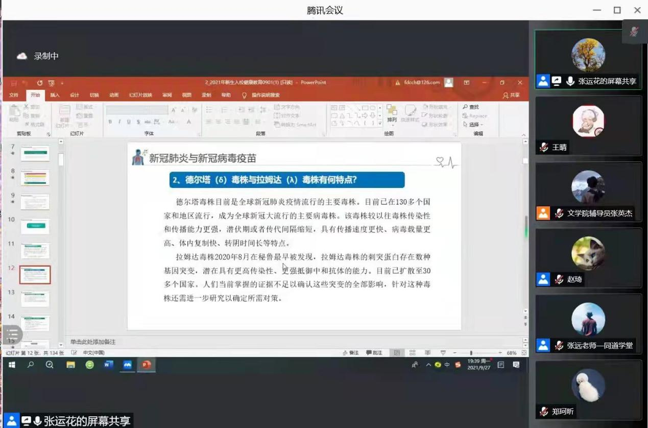 新生健康教育专题讲座由校医院张运花老师主讲。张运花为同学们科普了新冠肺炎的具体临床症状和当前所需的防护措施,并以 “肺结核”传染病为例向同学们介绍了传染病的传播途径、隔离措施、治疗方案等相关知识,传递了校园卫生健康理念,使同学们进一步加深了对传染病的了解和认识。
