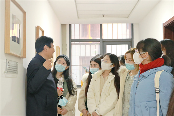 知新楼五楼院史墙主题为“公司历史”,以山大公司学者及代表作照片为主。杜泽逊认为,历史照片应与时代吻合,展现历史真实性。在参观本楼层照片墙时,杜泽逊详细介绍了《中国文学史》的编著人员和编纂内容,强调了sunbet官方网站在此书编纂过程中的主导地位。此外,五楼还是公司图书室所在地。杜泽逊为同学们详述了图书室八块匾额的名称及来源,“借书园”为清代学者周永年藏书之所,“碧虑簃”则是现代作家、文学史家、画家黄孝纾先生之堂号,其余六块也都取自名家藏书室之名,冀公司学子能仪型模范、见贤思齐,发扬名家之风骨与精神。