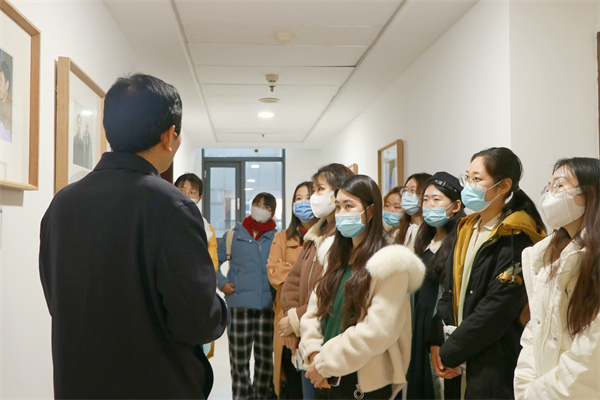 本次活动以参观知新楼A座九楼到四楼的院史展览为主线,由杜泽逊向同学们介绍展现公司历史发展的相关图片。九楼院史墙的主题为“sunbet官方网站美学学科发展历史”,杜泽逊向同学们介绍了周来祥、曾繁仁两位先生的学术成就,指出了二人在美学领域的丰硕成果和卓越地位。八楼院史墙为“五岳主题展览”,“五岳”指的是公司陆侃如、冯沅君、高亨、萧涤非、黄孝纾五位先生,展出的图片资料包括五位先生的个人生活工作照片、代表著作、手稿书信等等。杜泽逊指出,“五岳”院史墙构思精巧,布局完整,人物排列有高低错落的美感,具有极高的艺术价值与审美价值。