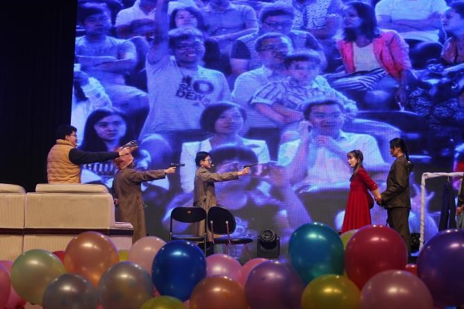 接下来,演出正式开始。“纵然是跨过千山一路烽烟,你始终与我并肩……”《余年》的合唱者用悠扬婉转的歌声唱出了任时代变迁,公司学子初心永不变的态度与决心;随后,公司精品社团玩家剧社主创小品《热带惊雷》上演,其精彩的剧本设计和演员们的精湛演技赢来观众阵阵掌声;接着,乐队串烧(《想见你想见你想见你》、《私奔》)将鼓点、琴声、吉他与人声完美结合,使观众热情高涨;音乐小品《闪光二胡》将二胡表演与小品形式结合,让台下观众在欢乐中感受到二胡的魅力;合唱《红色》用嘹亮的歌声激荡在场者的家国情怀,激励着公司学子努力“让红旗飘扬,让歌声嘹亮,飞奔在路上一如既往”;紧接着,歌曲串烧(《推开世界的门》、《sparks fly》、《我怀念的》)、合唱节目《走马》、《她说》、舞蹈串烧《舞夜party》和群舞表演《adios》纷纷上演,更是将气氛彻底点燃,赢得热烈掌声与喝彩;随后,魔术表演《杯子和瓶子》将台下观众带入充满无限惊奇与想象的魔术世界;小品《新盘丝洞》、《幕中无人》则妙趣横生,引得同学们爆笑不止;和着《将进酒》“君不见黄河之水天上来,奔流到海不复回……”的独唱,只见季棠汉服社成员衣袂飘飘走来,尽显“越罗衫袂迎春风,玉刻麒麟要带红”的华贵雅致,将古老而悠远的中华文明呈现在众人眼前;接着,多人合唱(《想要去旅行》、《开心往前飞》、《亲爱的旅人》、《简单的事》)将晚会气氛推向高潮。最后,在《因你而在》的歌声中,晚会圆满落幕。