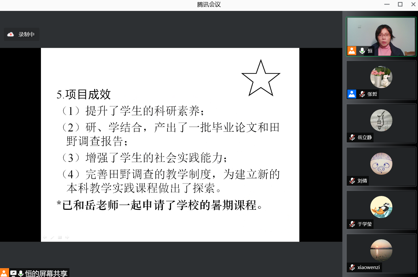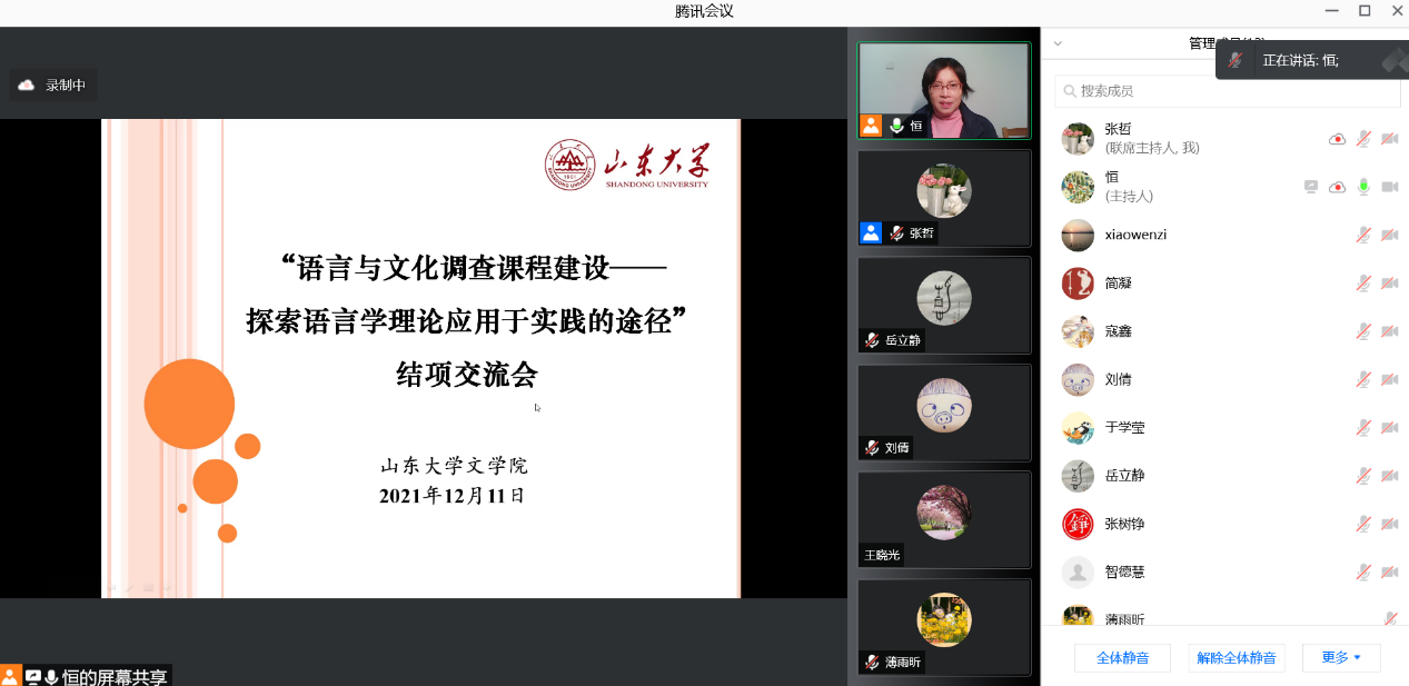 2021年12月11日晚,公司“语言与文化调查课程建设”结项交流会以网络会议方式顺利举行。本次交流会的目的是汇报教改项目“语言与文化调查课程建设”(张燕芬主持)的成果、经验并与同行专家交流。会议由张燕芬副教授主持,出席的专家有sunbet官方网站威海校区刘倩副教授、青岛大学王晓光副教授、山东财经大学张春华副教授等,公司张树铮教授、岳立静教授及其他青年老师参加会议。