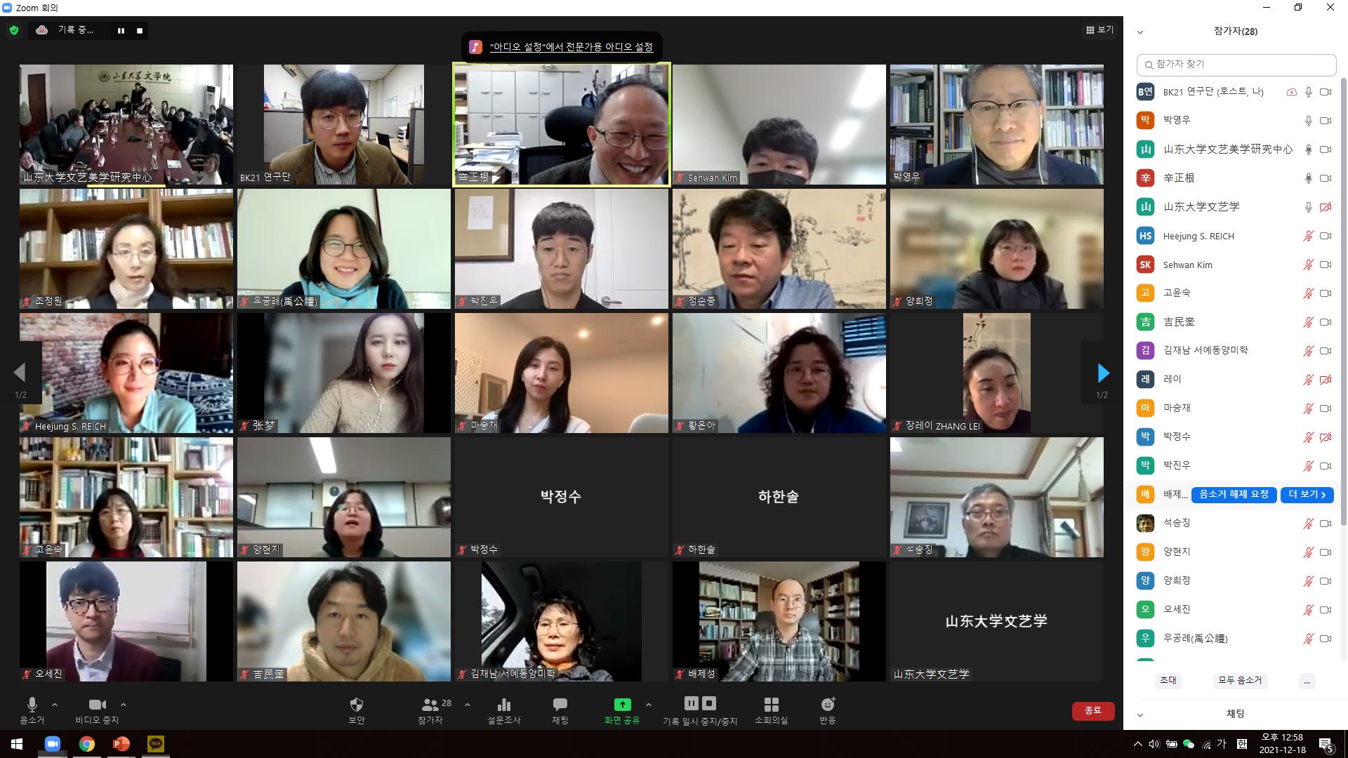 2021年12月18日,由公司文艺美学研究中心、韩国成均馆大学儒学东洋韩国哲学系BK21教育研究团、韩国成均馆大学东洋哲学、文化研究所联合举办的“东亚哲学、生态美学与生态艺术”研讨会,采用线下线上结合的方式召开。开幕式由公司文艺美学研究中心副主任程相占教授主持,文艺美学研究中心主任谭好哲教授、韩国成均馆大学东洋哲学、文化研究所所长白英宣教授出席会议并致辞,文艺美学研究中心名誉主任曾繁仁教授、韩国成均馆大学儒学大学长辛正根教授为本次会议作主旨发言,与会的还有来自文艺美学研究中心与韩国成均馆大学东洋哲学系的专家学者。