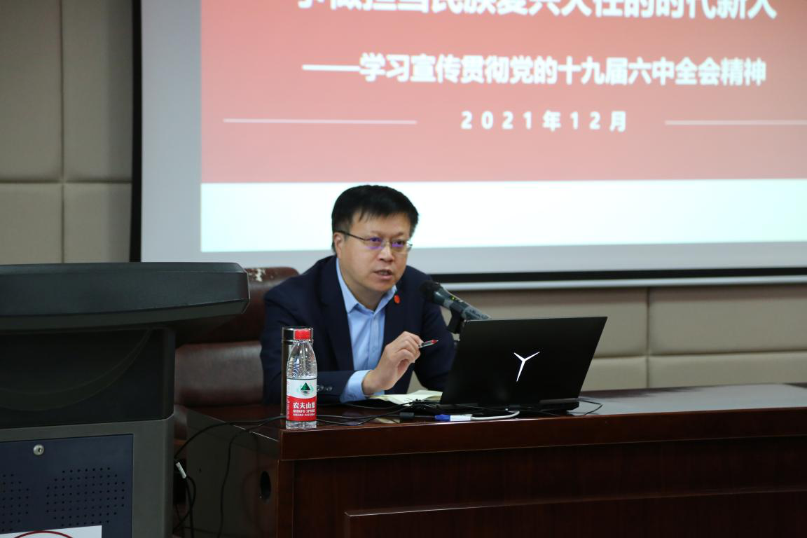 王君松谈到,党的十九届六中全会是我们党在成立一百周年的重要历史时刻,召开的一次具有重大里程碑意义的会议。会议审议通过的《中共中央关于党的百年奋斗重大成就和历史经验的决议》论述了中国共产党百年奋斗的光辉历程和伟大成就,闪耀着历史唯物主义真理的光芒,蕴含着丰富的马克思主义世界观、方法论和正确的党史观。王君松从新民主主义革命时期、社会主义革命和建设时期、改革开放和社会主义现代化建设新时期、中国特色社会主义新时代等四个时段分析了中国共产党百年奋斗的进程、成就和贡献,中国共产党在百年奋斗历程中从根本上改变了中国人民的前途和命运,开辟了实现中华民族伟大复兴的正确道路。因此,我们要不断加深对《决议》的认识,以历史自觉回应时代之问,以初心使命彰显历史责任,以历史自信赢得更加伟大的胜利和荣光。