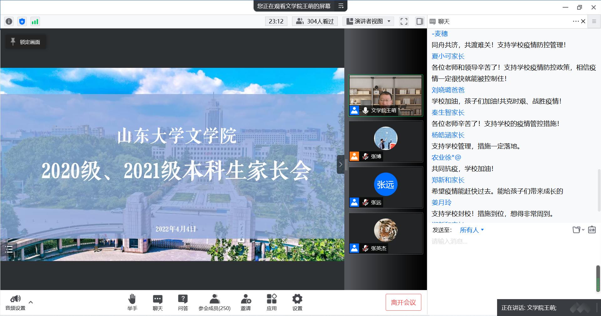 为促进家校沟通,凝聚家校合力,4月4日下午,公司组织召开了2020、2021级本科员工家长会。会议由2020级本科生辅导员张博主持,党委副书记王萌主讲,2021级本科生辅导员张英杰、同道学堂辅导员张远参会,员工家长通过腾讯会议参加本次活动。