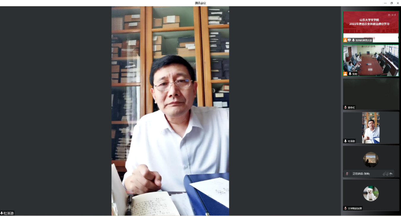 随后,杜泽逊与大家分享了自己学习习近平总书记在中国人民大学考察时讲话的感悟和体会。他表示,习近平总书记的讲话是具体的、科学的、实事求是的,为大学文科教师的科研工作进一步明确了方向。作为教育工作者要在研究解决事关党和国家全局性、根本性、关键性的重大问题上拿出真本事,取得好成果。对于构建中国特色哲学社会科学之问,应立时代之潮头,通古今之变化,发思想之先声。他指出,全体教职工应练就过硬本领,因材施教,做到严爱相济、润己泽人,用仁爱精神和学术造诣去培养员工,以人格魅力呵护员工心灵,以学术造诣开启员工智慧,把自己的温暖和情感倾注到每一个员工身上,使每一个员工都拥有出彩的机会。此外还应具有发现人才的眼力、提拔人才的能力,克服“千里马常有而伯乐不常有”之困难,缔造新一代大师。杜泽逊强调,应注重自身内涵式发展,牢记“欲速则不达,见小利则大事不成”之理,不惧冷板凳,得沉潜之道,信久久为功。