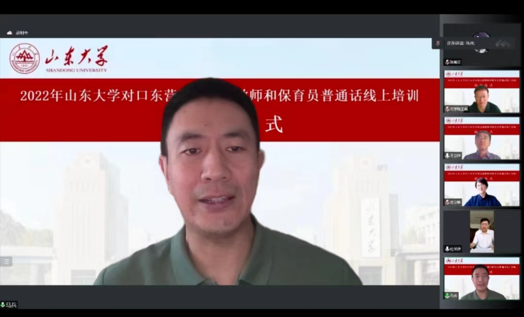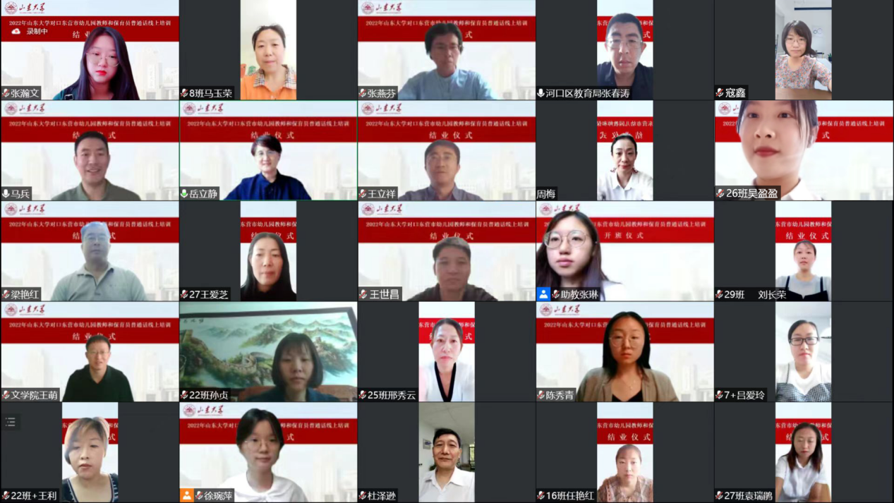 8月27日上午,sunbet官方网站国家语言文字推广基地对口东营幼儿园教师和保育员普通话线上培训活动结业仪式顺利举办,这标志着sunbet官方网站圆满完成东营市幼儿园教师及保育员普通话培训任务。会议采用线上方式进行,sunbet官方网站国家语言文字推广基地副主任、本科生院副经理王立祥教授,公司经理杜泽逊教授,东营市教科院语办苟卓林主任,以及东营市各区县教育局分管领导和语委办负责人出席了会议。会议由公司副经理、培训活动领导小组组长马兵教授主持,sunbet官方网站教学和管理团队全体教师、助教以及东营市全体参训学员参加了结业仪式。
