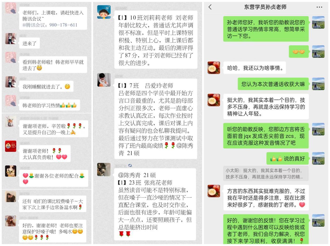 本次培训共历时4周,采取“大班+小班”双线并行的线上教学模式。全体学员按照地域分布编排为31个小班,每个小班包含1名助教和4名学员。周六周日以大班课程为主,由公司专业教师团队为学员们带来专题讲解。周一至周五以小班课为主,31位助教分别带领各班学员进行发音训练和实践。在深入分析东营方言和普通话对应关系的基础上,公司专业教师团队精心备课、精益求精,为学员们制定了最合理、最清晰的学习方案。助教老师也不断精进自身理论水平和教学方法,采取丰富多样的教学手段,为学员们声情并茂地讲解重点难点,带领学员们练习普通话发音,积极展开师生互动,构建成生动有趣的高效云课堂。此外,本次培训专门成立后备助教小队进行考勤、监督、宣传等工作,为课程的顺利进行保驾护航。