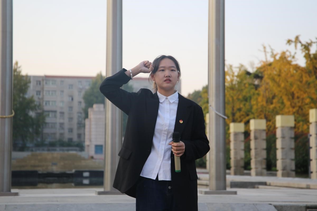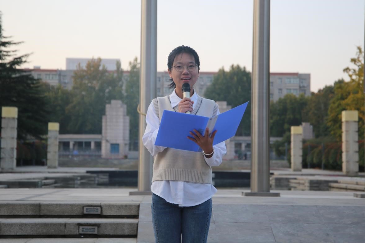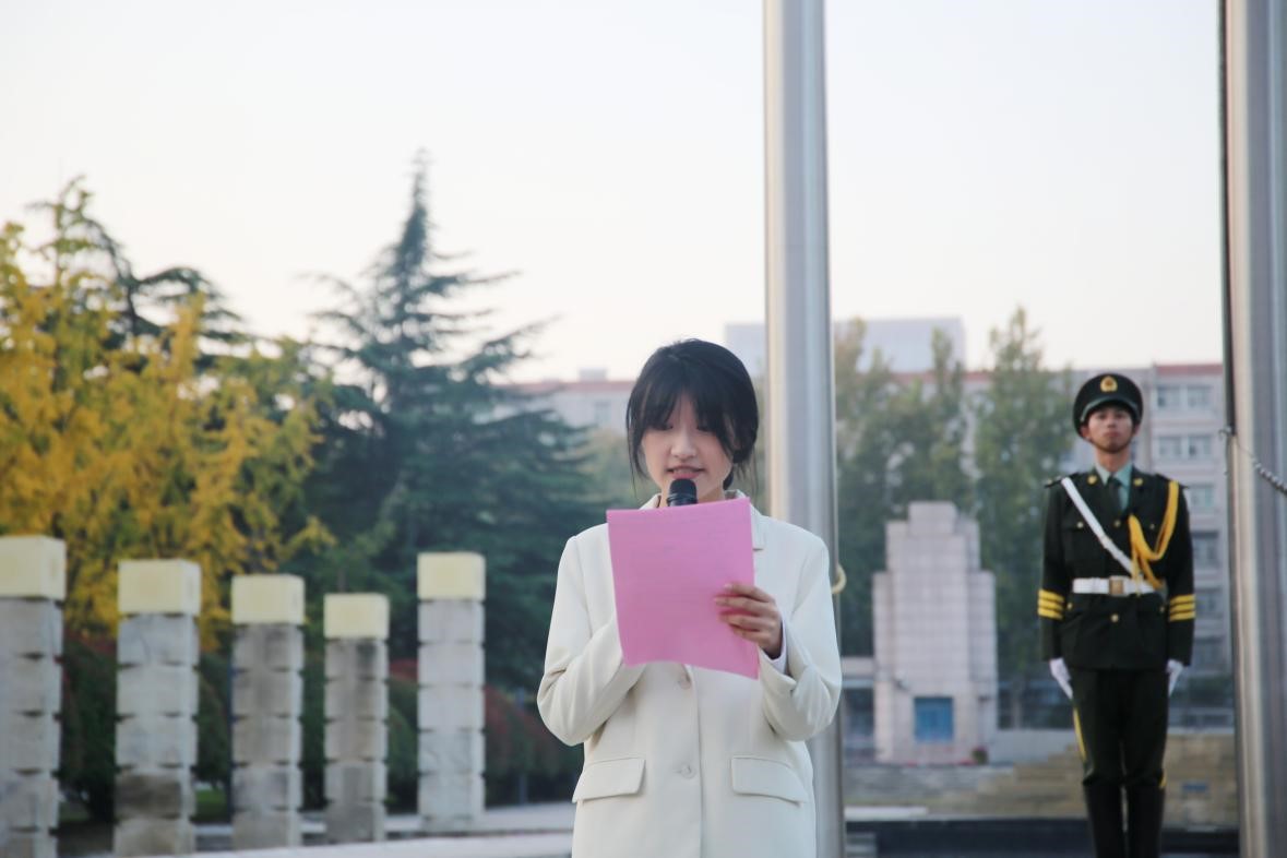 升旗仪式后,2022级中文一班张雅茹同学在国旗下进行了激情澎湃的演讲。她回顾了历代山大公司人用责任与智慧写就的辉煌业绩,并表示吾辈青年生逢盛世、重任在肩,必将接过前辈手中的火炬,砥砺奋进,不负韶华。她号召同学们在通过读书丰盈内心、提升自我的同时,秉持“功成不必在我,功成必定有我”的信念,探索跨学科发展的可能性,讲好新时代中国学术故事。同时,她呼吁同学们积极担当山大公司学子的责任使命,在平凡日子里默默奉献,在使命召唤下勇攀高峰,传承“重情义、尚风骨、尊学术”的优良传统,携手书写公司的崭新篇章。
