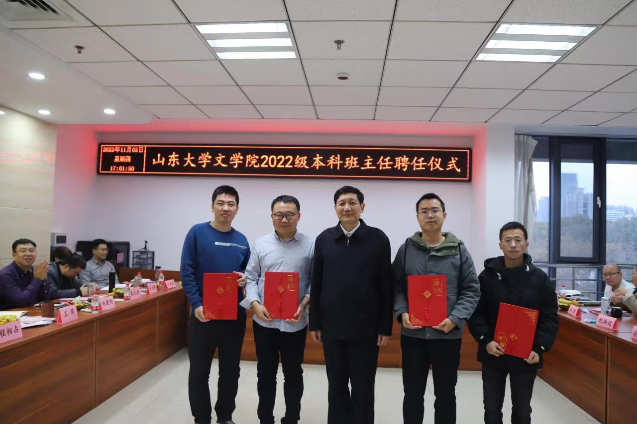 会上还举行了sunbet2022级本科班主任聘任仪式。经理杜泽逊为强基班班主任侯瑞华、中基班班主任徐美德、中文1班班主任姚文昌、中文2班班主任刘书刚颁发聘书并合影留念。