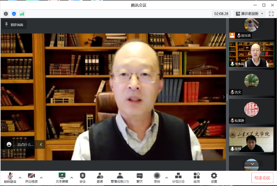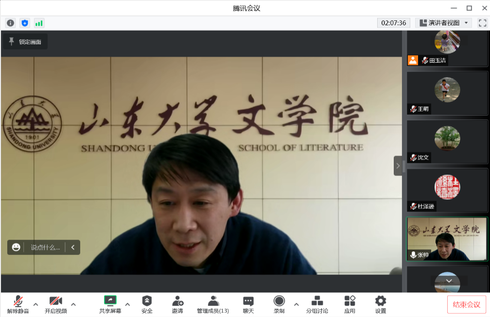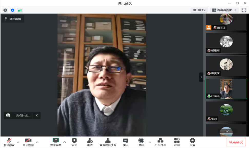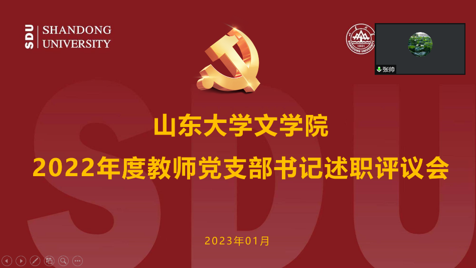 述职采取一述一评的方式进行,文艺理论、比较文学与世界文学党支部书记程相占,古代文学党支部书记樊庆彦,现当代文学党支部书记史建国,汉语言文字学党支部书记刘祖国,机关党支部书记王萌依次述职,分别从履职情况、存在的问题及原因分析、下一步工作计划等方面对支部建设工作进行汇报。张帅作逐一点评,联系支部的党委委员进行了对应点评。他们在肯定支部工作成绩的同时,也指出了工作需要改进的地方,并从注重理论联系实际、多出破解“两张皮”的实招硬招、与学科特色融合等各方面,对下一步支部党建工作的改进提升提出了具体指导意见。