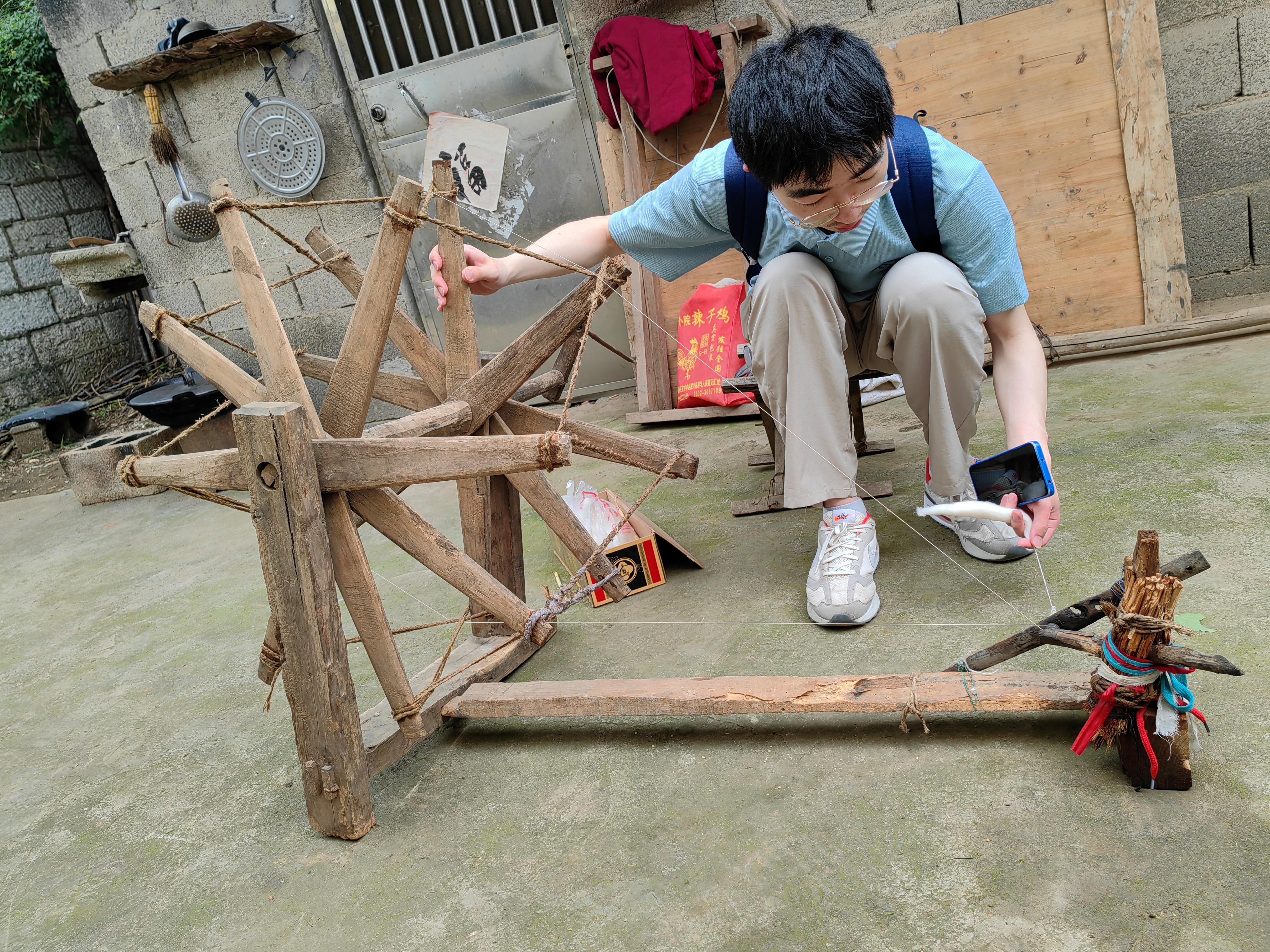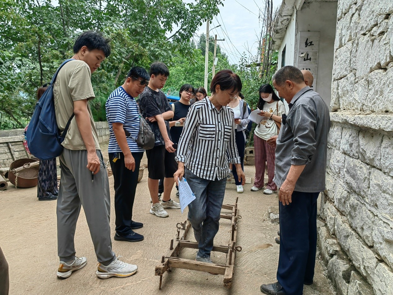 在词汇调研方面,同学们按自由组合的方式,分成农业生产、农村建筑、家具用品、服装纺织四个小组进行调研。调研首日,师生驱车前往山亭区红山峪民俗博物馆,近距离参观磨、犁、碌碡、纺车等农业生产用具,簸箕、风箱、扁担等家具用品,以及高粱、芝麻、花椒等农作物,详细了解传统农业农村生产生活用品的方言词,以及其特殊读音、词汇意义和实物样品,并对其进行分类和拍照记录。调研次日,师生分小组对前日调查中的相关词汇进行词条录入、图片对应以及数据电子化,并针对其差异性进行分析交流。这一部分数据将为进一步完善中国语言资源工程项目“山东农村传统生产生活词汇调查与数据库建设”起到补充作用。