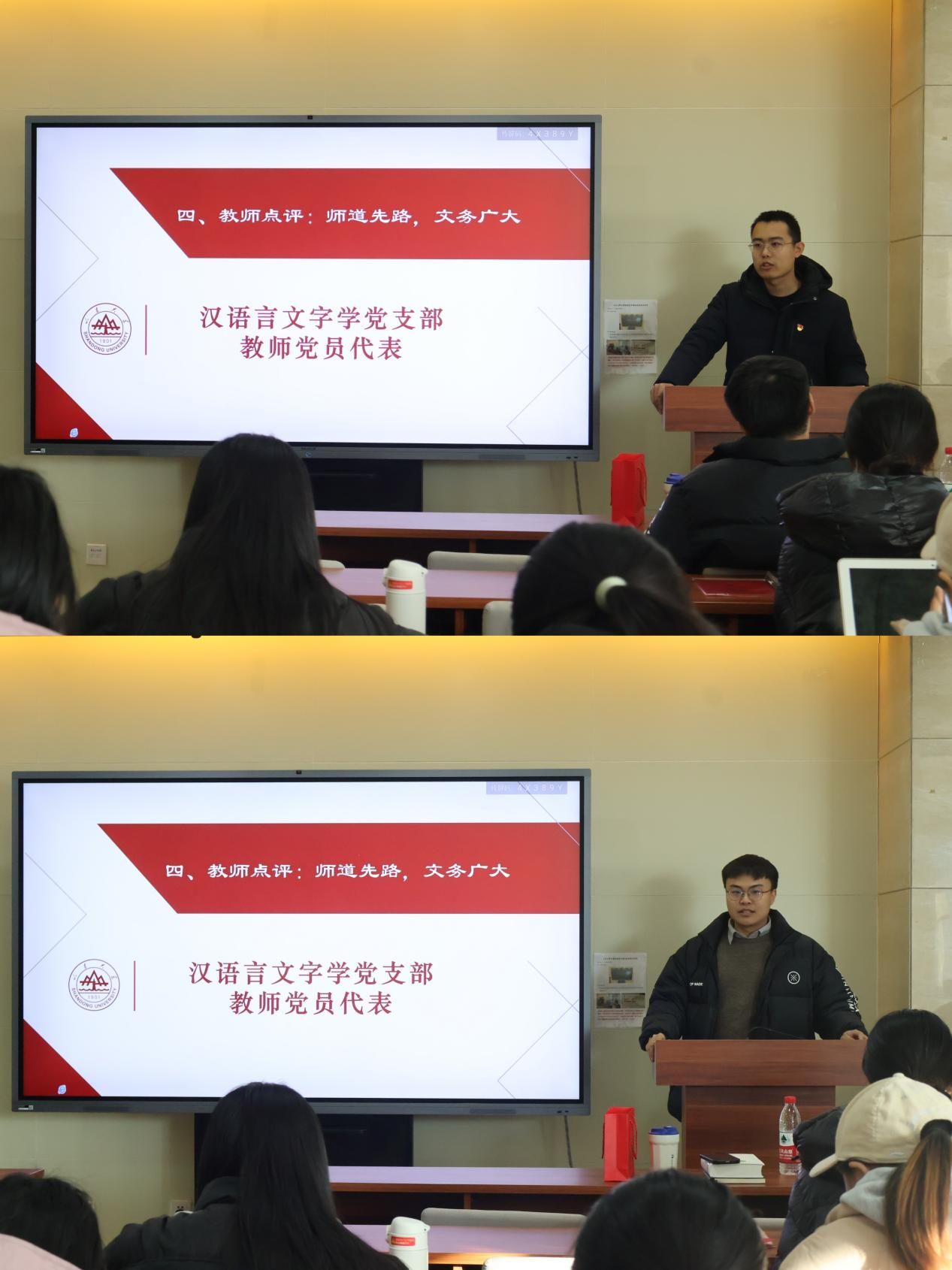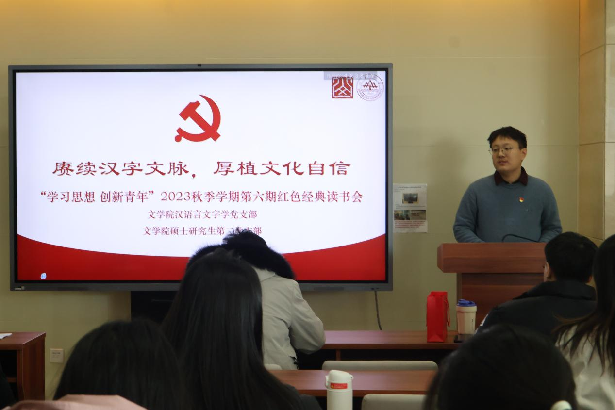 为深入贯彻习近平文化思想和习近平总书记在文化传承发展座谈会上的讲话精神,引领青年学子坚定文化自信,厚植家国情怀,12月20日下午,公司汉语言文字学党支部和硕士研究生第二党支部在知新楼A606联合举办“学习思想,创新青年”2023年秋季学期第六期读书会。公司汉语言文字学党支部书记刘祖国,教师党员代表李振聚、侯瑞华、程浩芯、郭帅、徐小娜、张彧,研究生辅导员果娜,本科生党支部书记孙雅乔出席会议。会议由公司硕士研究生第二党支部书记张英杰主持,硕士第二党支部全体党员,硕士第三、第五、第六党支部及本科生党支部党员代表参加会议。