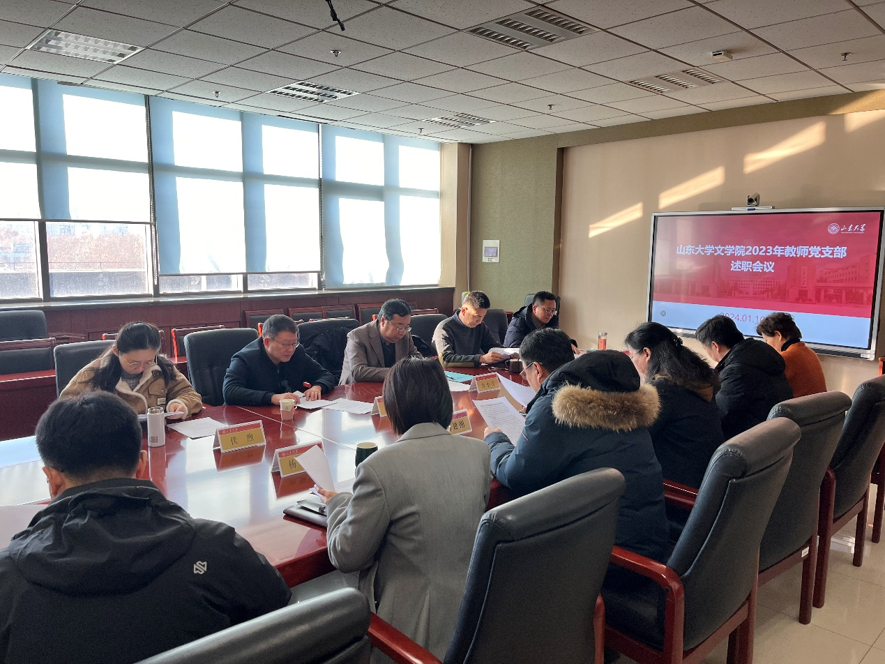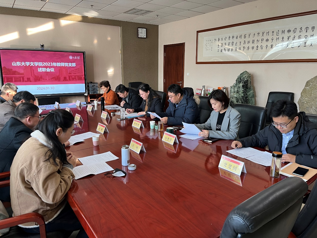 述职采取一述一评的方式进行,汉语言文字学党支部书记刘祖国,现当代文学党支部书记史建国,文艺理论、比较文学与世界文学党支部委员伏煦,古代文学党支部书记樊庆彦,机关党支部书记王萌依次述职,分别从履职情况、存在的问题及原因分析、下一步工作计划等方面对支部建设工作进行汇报。郭春晓作逐一点评,联系支部的党委委员进行了对应点评。他们在肯定支部工作成绩的同时,也指出了工作需要改进的地方,并从注重打造党建工作品牌、凸显学科优势特色、多出破解“两张皮”的实招硬招等方面,对下一步支部党建工作的改进提升提出了具体指导意见。