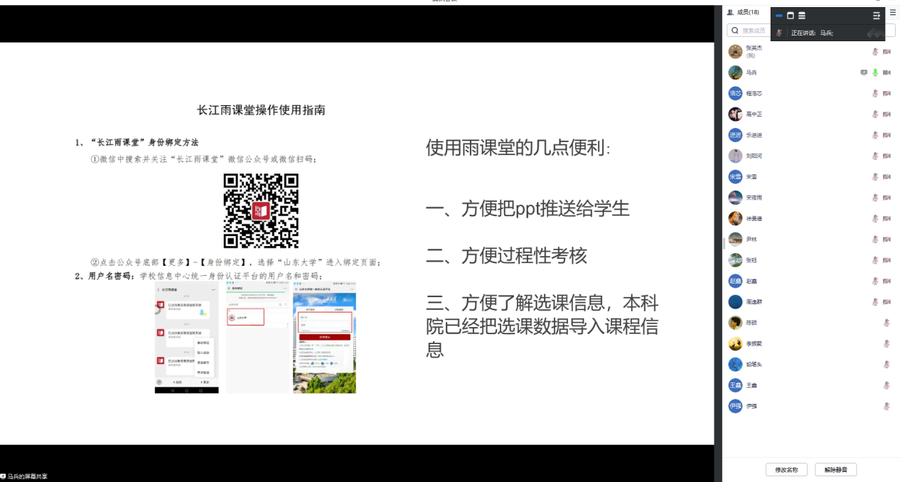 马兵指出,本次培训是基于前期开展的学情调研,针对同学们诉求比较强烈的方面而谋划组织的。他向老师们详细介绍了长江雨课堂的基本情况、使用方法和特色功能,并指出其在方便员工获取学习资源、方便教师进行过程性考核、方便掌握选课信息等方面的独特优势。马兵强调,希望老师们能够根据课程特点合理选择授课方式,充分利用公司公司的教学平台和各类资源,在满足员工学习需要的同时提升教学过程的规范性和创新性,真正促进教学相长,不断推动公司本科教学的高质量发展。