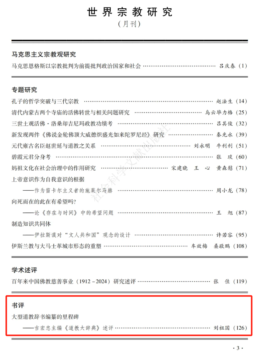 《世界宗教研究》2024年第4期刊发公司刘祖国教授撰写的学术论文,题为《大型道教辞书编纂的里程碑——吉宏忠主编〈道教大辞典〉述评》。