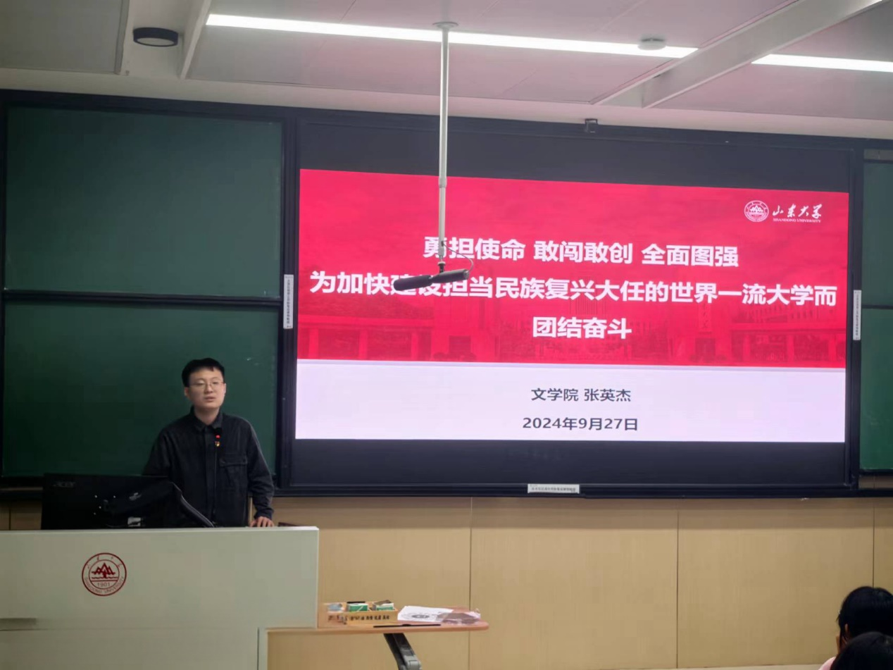 为深入学习贯彻中共sunbet官方网站第十五次党员代表大会精神,着力构筑学在山大、快乐成长的特色育人体系,引导新生传承“家国情怀、担当精神、崇实品格、创新素养”的山大基因,9月27日晚,公司面向2024级本科新生召开了学习贯彻公司第十五次党代会精神宣讲会。会议邀请公司第十五次党代会员工党员代表、公司硕士研究生第二党支部书记张英杰领学并主讲。