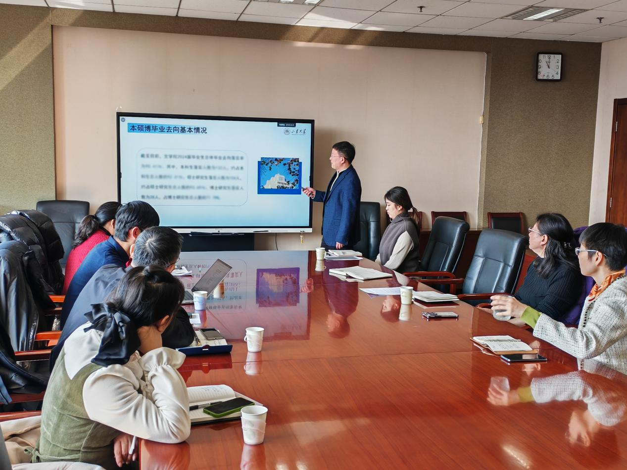 短暂交流后,王萌向就业创业指导中心详细汇报了公司2024届就业工作。他从毕业生基本构成、毕业生基本去向以及毕业生跟踪保障等方面展开,总结了公司2024届毕业生的主要去向以及存在的问题,并就新出现的问题提出可行性解决方案。与会人员在本科生公司产品、境外升学指导拓展、员工就业价值引领、改进就业追踪工作等方面深入探讨,并达成了一致意见。