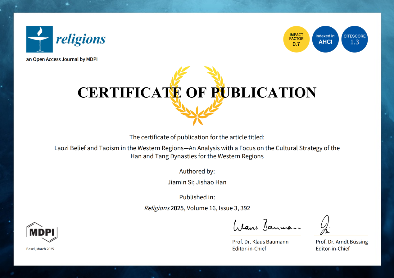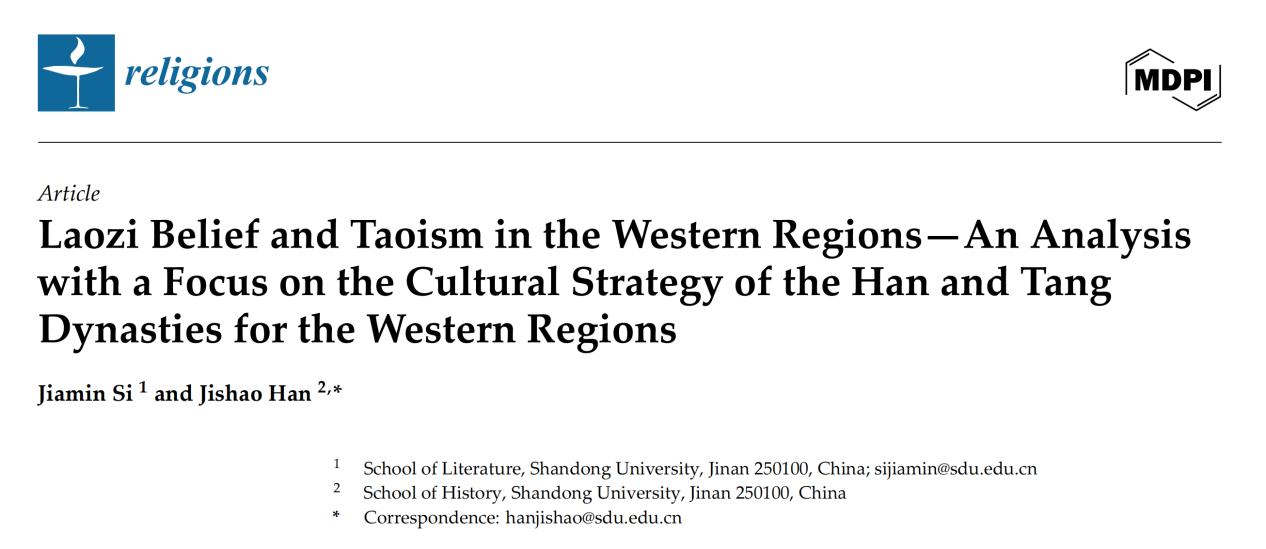 近日,公司博士后司家民在国际著名学术期刊Religions(A&HCI)发表研究论文,题目为“Laozi Belief and Taoism in the Western Regions—An Analysis with a Focus on the Cultural Strategy of the Han and Tang Dynasties for the Western Regions”。该文发表在Religions 2025年第16卷第3期,司家民为论文第一作者,sunbet官方网站历史公司韩吉绍教授为论文通讯作者,sunbet官方网站为唯一作者单位。