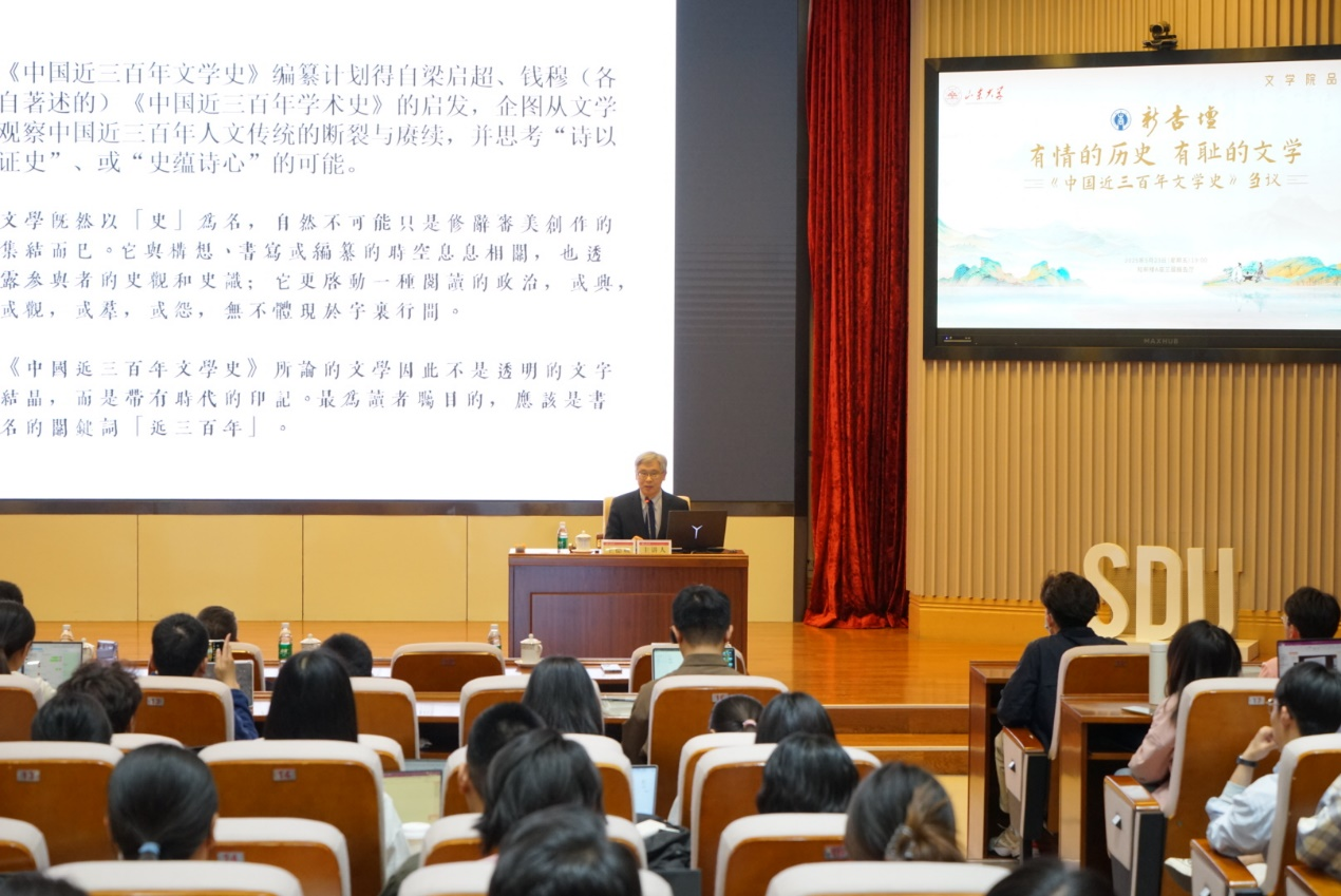 王德威教授首先从《中国近三百年文学史》的编纂背景切入,表示其灵感源于梁启超与钱穆在20世纪20年代和30年代各自著述的《中国近三百年学术史》。他认为,梁启超与钱穆虽身处同一时代,却对清代学术史形成“同时之异世,并在之歧出”的对话。梁启超“以复古为解放”,强调清学的革新性。钱穆则主张宋学传统的赓续,认为“万变不离其宗”。这种共时性中的参差对照为文学史编纂提供了重要的方法论启示。王德威教授表示,传统文学史多遵循线性叙事,将重要的年份、事件、人物串联起来,以国家、民族为框架加以梳理,而《中国近三百年文学史》的编纂试图突破“起承转合”的文学史编写定式,以“三百年”为动态坐标,重新审视文学与现代性的复杂互动。随后,王德威教授详细介绍了《中国近三百年文学史》的四个切入点:今古之争、文史之交、华夷之变、情理之间。在“今古之争”话题下,他剖析了晚清至五四时期“今古”概念的嬗变,指出今古之间早已不再壁垒分明,这场思想论争始终贯穿知识体系与社会变革的深层互动;在“文史之交”话题下,他指出“文”与“史”需相互为用,尤其强调“文”的审美创造与知识生成功能,同时还需重视“隐秘写作”在文学史中的份量;在“华夷之变”话题下,他通过区分“辨”与“变”的不同内涵,观察清代以降“华夷”概念的动态变化,揭示文化身份的建构过程;在“情理之间”话题下,他梳理了中国传统的情感论述,指出当今社会的困境,以及重视“情理”转换的必要之处。 讲座最后,王德威教授深入阐述了“有情的历史”与“有耻的文学”的观点。“有情的历史”这一灵感源自沈从文1952年家书中提及的“事功和有情”二者之别,王德威教授强调文学史不应仅是“事功”的罗列,更应承载对于历史的深切感受与深至的爱。他通过分析刘鹗、梁启超到鲁迅、张爱玲,再到一众海外华人作家的情感状态,深刻指出文学史的本质是承载民族痛感与温情的“有情之史”,能为当下重审文明脉络提供情感认知维度。而“有耻的文学”则源自顾炎武“博学于文,行己有耻”的训诫,王德威教授将其拓展为一种带有审美价值的道德判断力,既包含对历史的反思,也指向知识分子的自省。