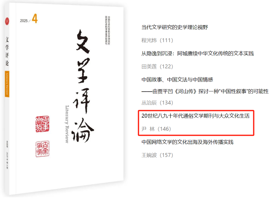 《文学评论》2025年第4期刊发了公司尹林研究员撰写的学术论文,题为《20世纪八九十年代通俗文学期刊与大众文化生活》(起止页码:146-156)。