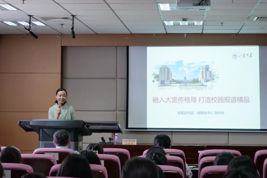 会议伊始,谢婷婷以“融入大宣传格局,打造校园报道精品”为主题,围绕“如何选主题”“如何写新闻”以及“如何讲特色”三个方面进行阐述。她系统梳理了新闻写作规范与报道策略,分享了从内容创作到传播推广的完整路径,指出宣传报道要乘“时”顺“势”,立足国家发展大势,深挖sunbet官方网站特色、紧扣育人主线,充分发挥宣传工作在思想引领、资源聚合及价值传递等的重要价值。她鼓励同学们不断锤炼高强本领,自觉担负起举旗帜、聚民心、育新人、兴文化、展形象的使命任务,积极践行“小切口,大情怀,正能量”的创作理念,以青春视角讲好山大故事、以行动担当传播山大声音,助力山大新闻宣传工作提质增效。