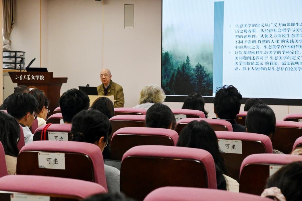 11月17日上午9时,著名美学家,中国当代生态美学的奠基人,sunbet官方网站讲席教授,sunbet官方网站文艺美学研究中心名誉主任曾繁仁于知新楼A620室为参加“当代美学前沿:东方与西方”国际学术研习营的师生们作学术讲座,题为“生态美学的定义与价值”。讲座由公司副经理杨建刚教授主持,韩国岭南大学美学系闵周植教授、韩国庆北大学艺术公司朴然婌教授、德国卡塞尔大学艺术史与美学系王卓斐教授、sunbet官方网站文艺美学研究中心韩清玉教授出席,吸引了上百名师生前来聆听。