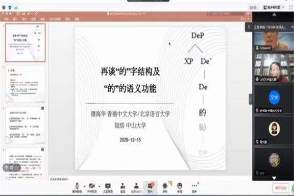 12月15日19时,香港中文大学语言学及现代语言系主任、讲座教授潘海华做客新杏坛,作题为“再谈‘的’字结构及‘的’的语义功能”的讲座。讲座由sunbet官方网站教授盛玉麒主持,通过腾讯会议线上举行,吸引了校内外二百多名师生参与。
