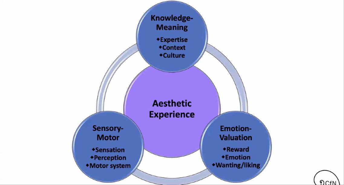 随后,查特吉教授介绍了以审美体验(aesthetic experience)为中心的理论框架图,用以讨论影响审美体验的三方面因素,依次是“知识-意义”(Knowledge-Meaning)、“感官运动”(sensory-motor)和“情感-评价”(Emotion-Valuation):