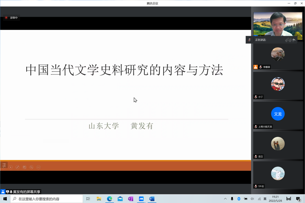 5月28日晚,公司以线上会议的形式举办了第七期山大文苑沙龙“现当代文学史料与期刊研究漫谈”,特邀公司常务副经理黄发有教授担任主讲,介绍中国当代文学史料研究的内容与方法。沙龙由公司2018级本科生李雅琪主持,黄发有教授主讲,共有六十余名师生参与。