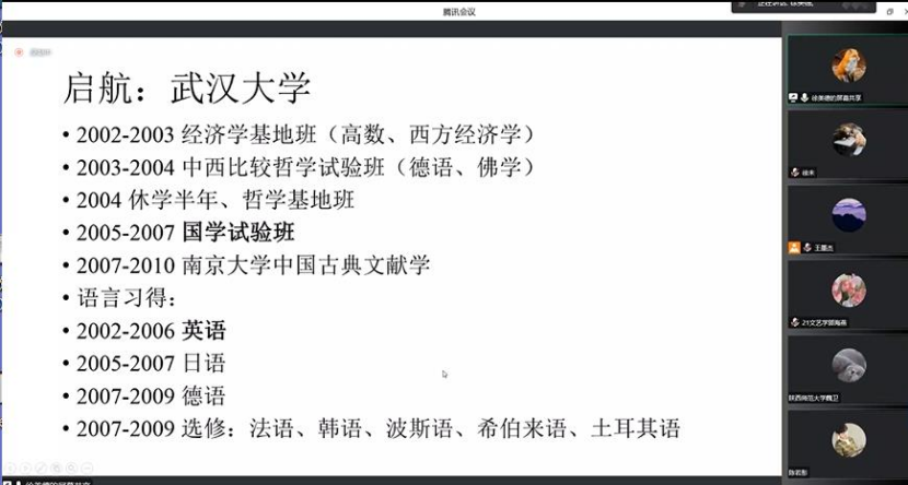 接下来,徐美德老师重点讲述了他多年求学的经历。从武汉大学启航,由经济学基地班转入中西比较哲学试验班,在2002-2009年期间先后修习了包括土耳其语、希伯来语等在内的八种语言。分享在武汉大学国学试验班的学习经历和阅读原典的体验时,徐美德老师提到,“抄书”是他在本科学习时记忆典籍的好方法。在大致介绍了本科阶段的学习旨趣后,徐老师阐述了他的学士、硕士论文的具体内容,对本、硕阶段的学习经历进行了简短的总结。