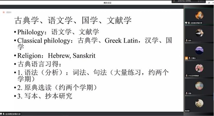 徐美德老师由轴心时代引入对文献学、古典学等学科中外异同的思考,并展示了国外古典语言习得的方式方法、课程设置,简单介绍了国内外文科建制的异同,并建议大家掌握相关的基础学科,以助于今后的学术研究。