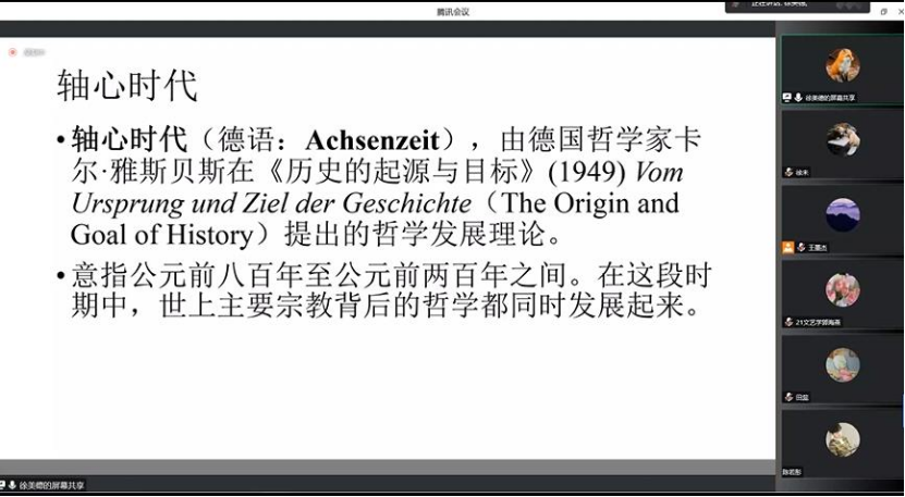 沙龙活动伊始,徐美德老师首先阐释了轴心时代的内涵,指出轴心时代来源于德国哲学家卡尔·雅斯贝斯提出的哲学发展理论,并向大家简明扼要地介绍了世界上主要的宗教和代表思想家。