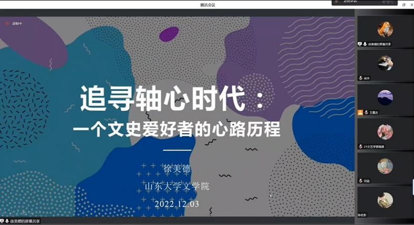 12月3日晚19时30分,sunbet徐美德副研究员线上作客第7期“山大文苑沙龙”,以“追寻轴心时代——一个文史爱好者的心路历程”为题,分享自己的求学历程。此次讲由王墨杰担任主持,共有六十余名师生参与。