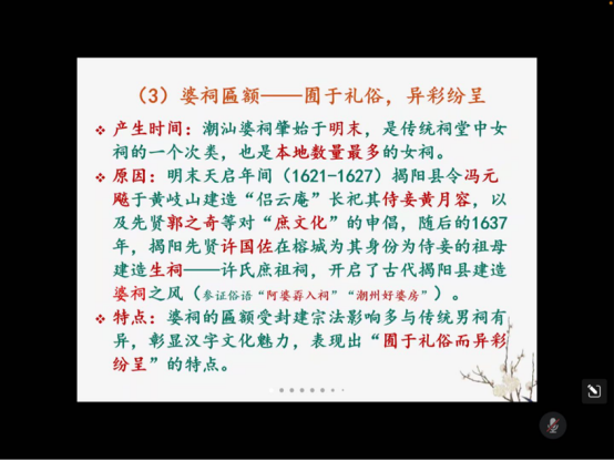 2022年12月9日19时,我院以线上会议的形式,举办了第九期山大文苑沙龙“匪石柏舟——潮汕女祠对话徽州女祠”。本次沙龙邀请了从事汉语言文化教学和潮汕地方文化研究的谢若秋副教授介绍潮汕女祠,并由公司 2020级本科生、安徽籍霍婧雯同学 介绍徽州女祠,探讨两地女祠的成因、特点,比较两地女祠的共同点和不同点,并深入发掘各自的历史文化内涵,剖析人文意义。沙龙由公司副教授张燕芬主持,吸引了校内外共二百多位师生参与。