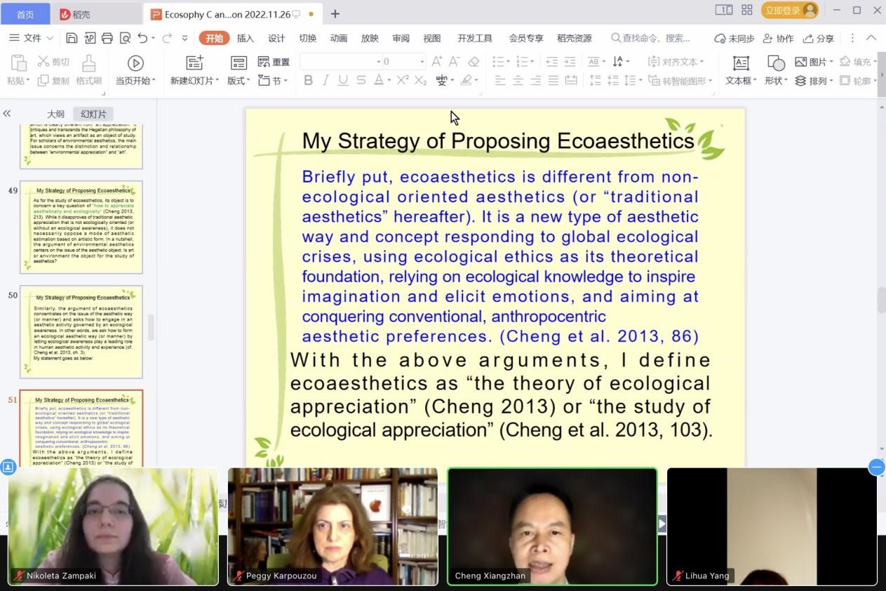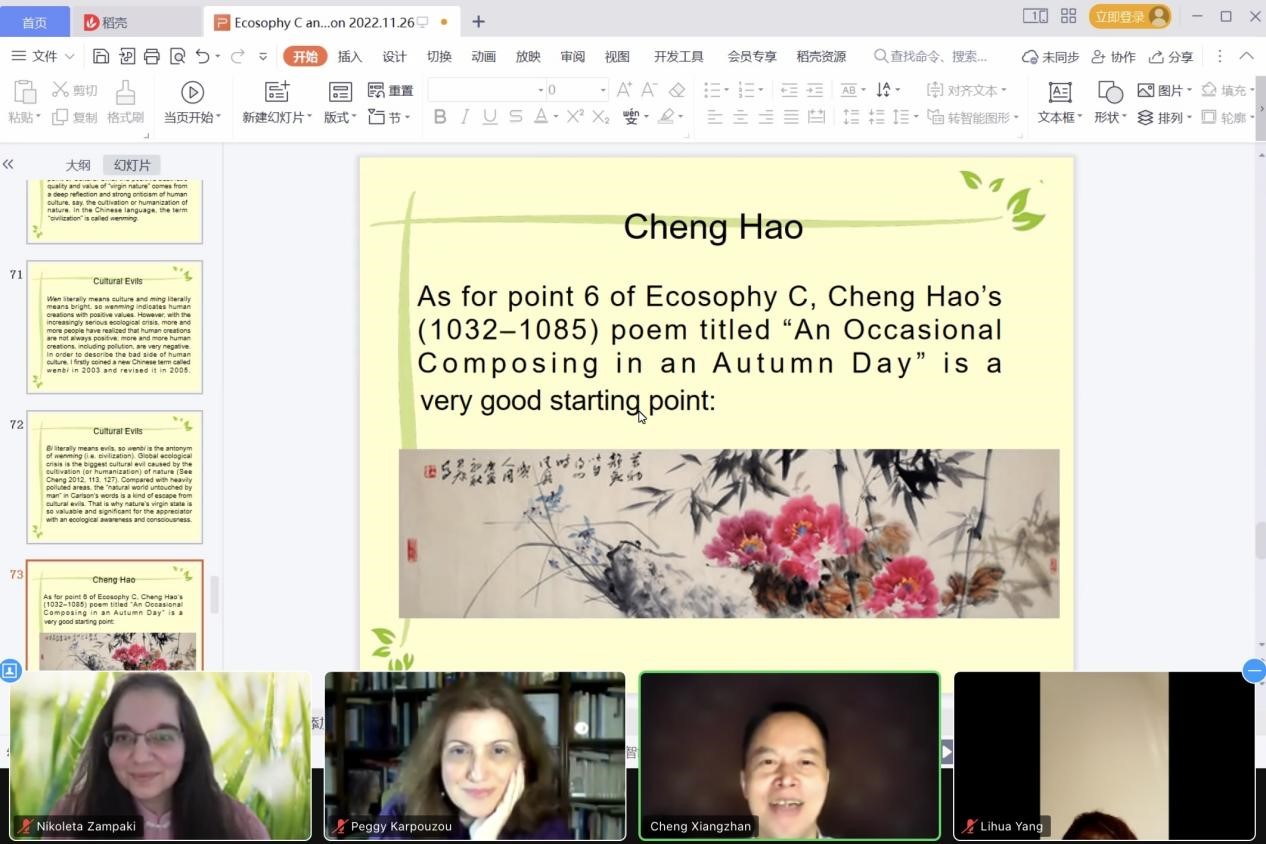 北京时间2022年11月26日,《生态人文主义杂志》线上系列讲座(Journal of Ecohumanism’s online lectures’ series)通过ZOOM会议软件顺利举办,公司程相占教授应邀做了题为Ecoaesthetics and Ecosophy C(《生态美学与生态智慧C》)的英语讲座。讲座由雅典大学尼可拉塔·赞帕基(Nikoleta Zampaki)主持,雅典大学佩吉·卡普祖(Peggy Karpouzou)教授出席并对程相占教授做了介绍。讲座吸引了来自希腊、埃及、巴基斯坦、美国等世界各地学者的热情参与。