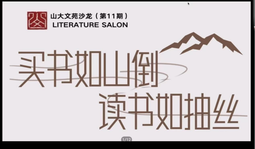 12月23日晚19时,公司以线上会议的形式举办了第11期山大文苑沙龙“买书如山倒,读书如抽丝”,肖映萱副教授与王鑫助理研究员以对谈的形式分享了自己的阅读经验。本次沙龙由肖映萱副教授主持,吸引了校内外一百余名师生参与。