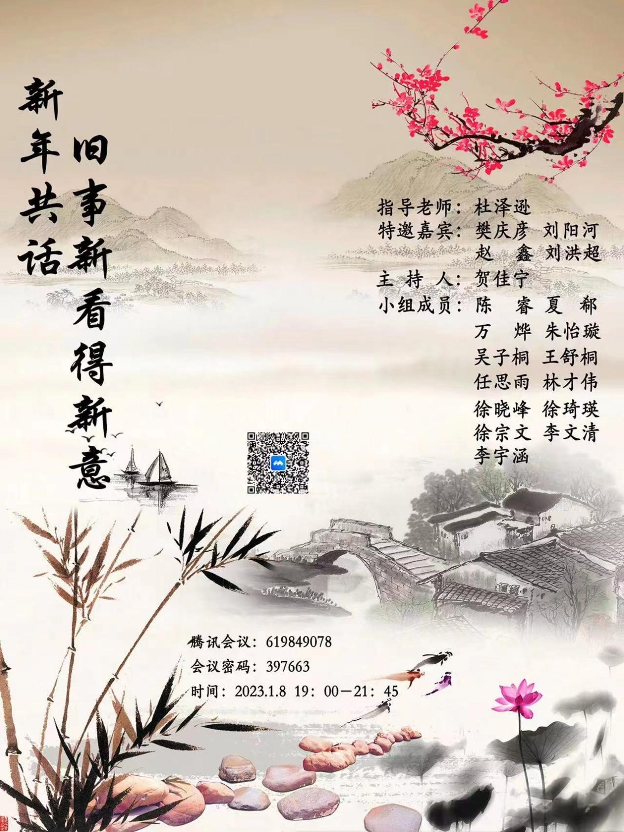 该项活动由杜泽逊经理牵头,邀请了樊庆彦老师、刘阳河老师、赵鑫老师和刘洪超老师和同学们一起交流分享。此次活动由贺佳宁同学担任主持,徐宗文同学负责海报制作,主要分为三个环节。首先是老师们对自己作出介绍,使同学们对自己不熟悉的老师有初步了解。紧接着是同学们的自主发言与师生问答。在这一环节中,同学们积极参与,徐宗文同学、吴子璇同学、王舒桐同学、林才伟同学、徐琦瑛同学、李文清同学、陶禹含同学、贺佳宁同学、夏郗同学、徐晓峰同学和王增雨同学与大家分享了自己的感悟,总结了自己一年的学习与生活,对接下来的一年进行了展望,并向老师提出了自己在治学和处世中遇到的困惑,老师们也耐心地给出了解答;参与讨论的同学们类型甚多,从大一本科生到博士生,同学们提出的问题面也涉及甚广,从治学读书到为人处世,有关于自己论文写作中碰到的困难、如何写好一篇论文的初阶问题,有开拓思维、放眼中外、关于如何阅读外国诗歌和外国学人研究汉学的认知问题,也有联系古今、关于古代文学中女性文学研究的态度问题,还有面向社会、关于老员工激烈竞争的现象成因分析,更有体察个人之情感、关于老师们的方向选择、治学经验乃至兴趣爱好的分享,以及对于治学工具运用的探讨……同学们认真总结自己在2022年的过往,开心地和老师同学们分享自己的感悟,虚心向老师们提出问题,一并展望自己的2023年。五位老师认真倾听了同学们的发言,依托自己的研究领域,结合自己治学处世的经验给同学们作出了耐心细致的回答,用人生的智慧和阅历解答了同学们的疑惑。在此项活动中,大家以“云端”的形式实现了共聚,在相互的分享交流中获得新知,碰撞出思想的火花,不论师生都收获颇多。第三个环节是杜泽逊经理的总结致辞。他以极其亲切温和的态度总结了此次活动,指出了此次活动对于大家开拓思维、增长见识、更好进行新年规划的重要意义。至此,此次的“新年共话 旧事新看得新意”主题沙龙活动圆满结束。