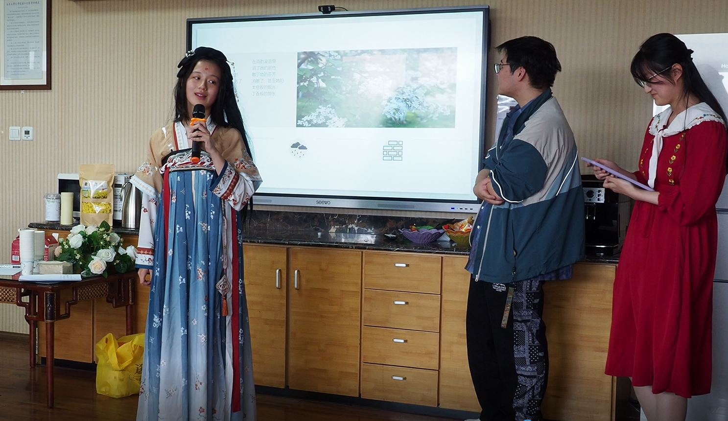 室内活动结束后,张燕芬老师带领大家前往文史楼前的长廊上进行诗词飞花令活动。吕瑞烨同学担任主持为大家科普飞花令是古人喝酒时用来助兴的一种文字游戏,得名于唐代诗人韩翃《寒食》中的“春城无处不飞花”。接着吕瑞烨介绍了本次飞花令活动的规则,行令时需说出含“花”的诗句,首选诗和词,选择的句子一般不超过七个字。本次“诗词飞花令”活动共比三场,难度层层递进。在比赛过程中,每位选手都拿出了自己的看家本领,既说出来“何须浅碧深红色”“春江花朝秋月夜”这样为人所熟知的名句,也能吟咏出“灼灼荷花瑞”“一之日觱发”这样生僻的佳作。大家打得有来有回,活动现场氛围热闹,更是有不少路过的同学驻足于此,想看看“状元”名头花落谁家。最后,姚佳、张逸轩等同学的小组凭借海量的诗词储备在激烈的角逐中摘得桂冠,领取了相关奖品。