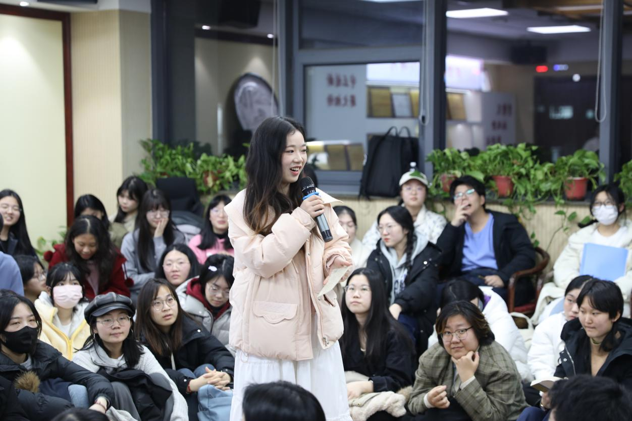 之后,“心理健康与女性发展”话题由霍婧雯主持,她以“精神内耗”这一热门话题引入,在她的引导下,同学们积极主动地分享经历、交流想法。有同学谈及曾遭遇的不幸经历,分享其走出阴影、治愈创伤的方法经验,并鼓励大家勇敢面对心理创伤,积极探索疗愈方法。同学们以此话题延伸思考,探讨社会评价体系与女性美丽标准的关系问题,有同学认为女性应当跳出当下“白、幼、瘦”的评价标准,探索属于自己的美丽,也有同学表示女性本就拥有“不美丽”的权利,无需屈从“美丽”的规则枷锁。此外,有同学提出,女性应当正确认识自身条件与所处环境,发觉自己的闪光点、找到自己的目标追求,对于既定规则标准既不盲从也不规避,而是按照自己的人生规划实现个人发展提升。