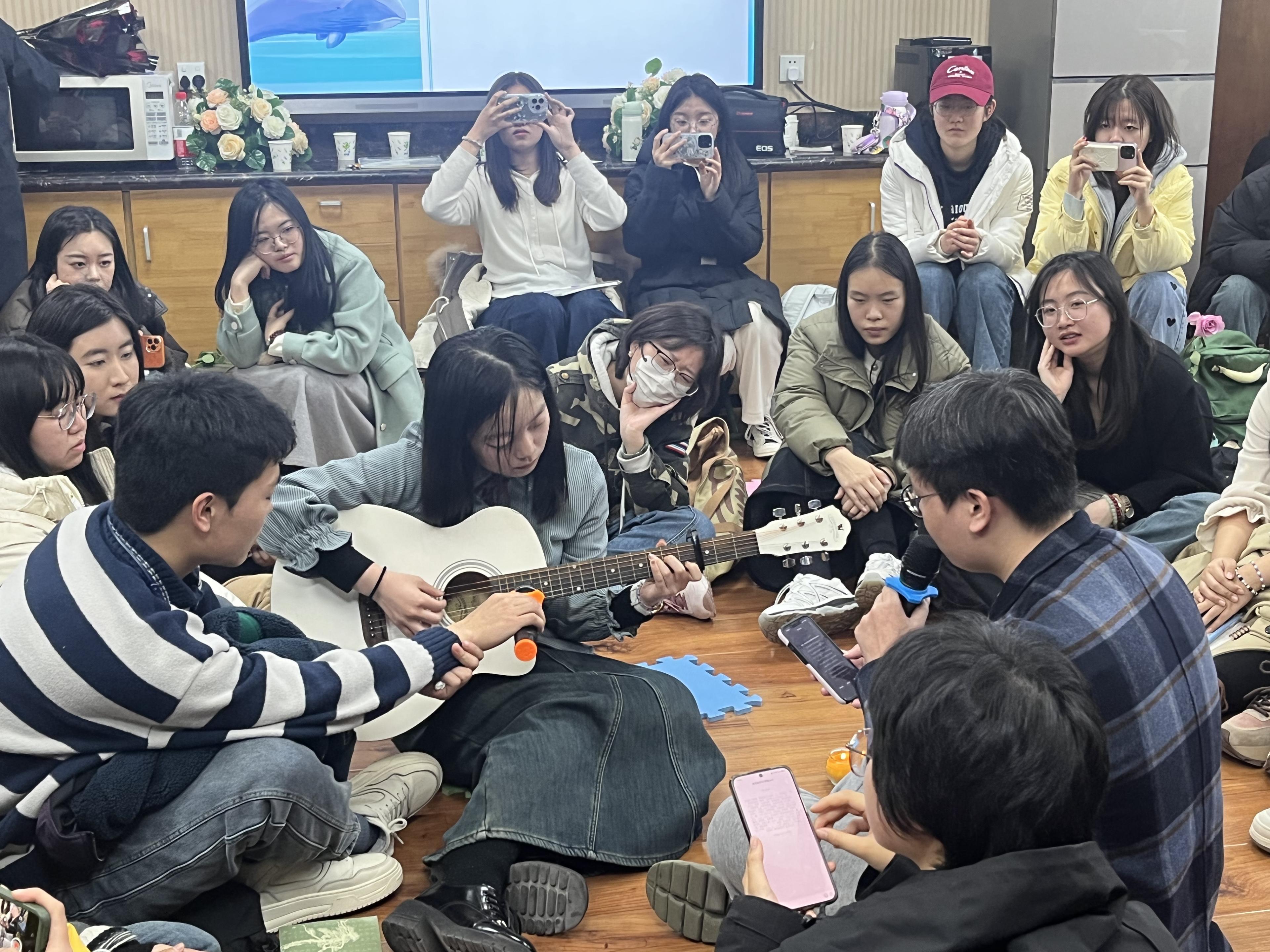 接着,吕瑞烨和陈赟昊为大家合作献上歌曲《送你一朵小红花》,歌声婉转,吉他悠扬,现场同学跟随音乐轻声唱和,义工同学送花,场面温馨和谐,大家都沉浸其中。
