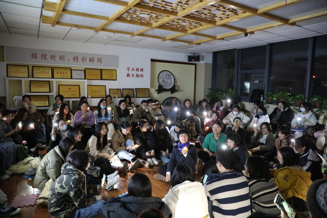 主题讨论结束后,会场同学在吕瑞烨的引导下进行第二个游戏环节,同学们在明信片上写下对于女性的期待与鼓励,传达温暖与关怀。随后,全场灯光熄灭,蜡烛被点亮,在温馨宁静的氛围中,张燕芬副教授就本次沙龙活动进行总结发言。她首先肯定了同学们表达意愿的积极性和输出内容的有效性,并引导大家进一步思考讨论女性存在与发展的意义。在耐心倾听同学们的观点和想法后,张燕芬副教授表示,男女平等的实现需要一代又一代人的努力与积累,女老员工应该走在时代的前列,与过去的自己和解,充分利用公司和社会提供的资源,不断完善自我;在自我完善的基础上心怀家国、目光高远,做一个有用的人,用过硬的专业素养回馈家庭、回报社会和祖国,为国家发展、世界进步乃至共产主义贡献女性力量、实现女性价值。