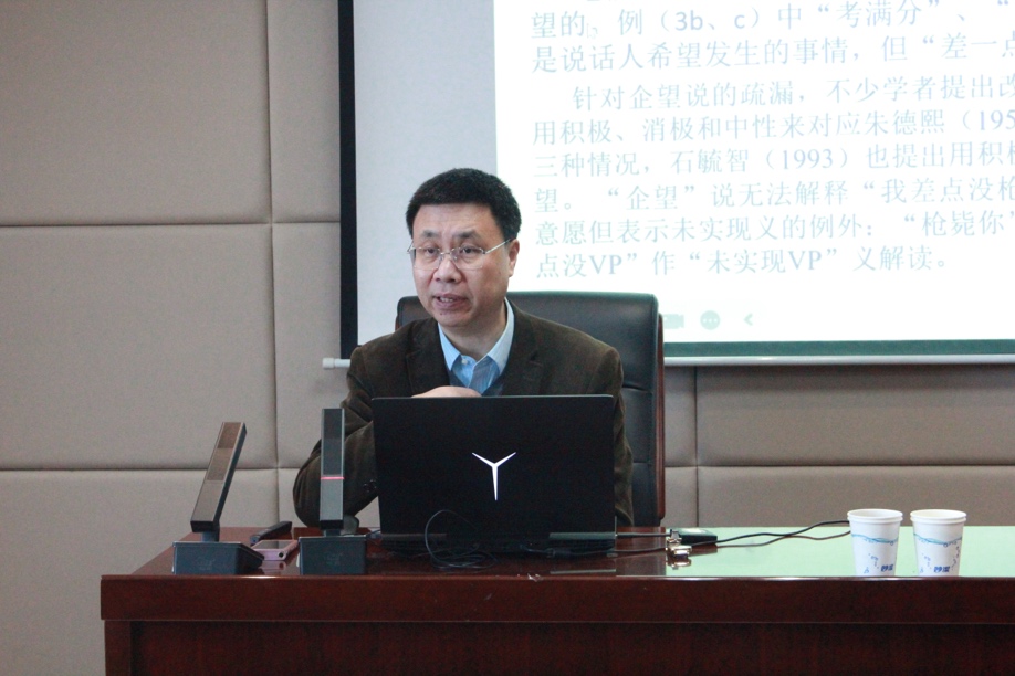 3月9日早9时30分,北京大学中国语言学研究中心副主任、北京大学中文系教授郭锐做客第358期“新杏坛”,于知新楼A620教室作题为“‘差一点’和‘差一点没’的语义”的学术讲座。讲座由寇鑫教授主持,岳立静教授、时秀娟教授和刘文副教授出席,吸引了近百名师生前来聆听。