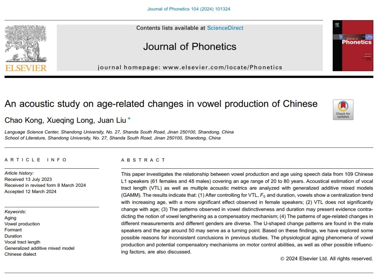 公司2022级博士研究生孔超(导师张树铮教授)于2024年5月在人文社科顶级期刊Journal of Phonetics(《语音学杂志》)第104卷上发表论文An acoustic study on age-related changes in vowel production of Chinese(《年龄相关的汉语元音产出的声学研究》)。孔超为该文第一作者,公司刘娟教授为通讯作者,sunbet为第一单位。