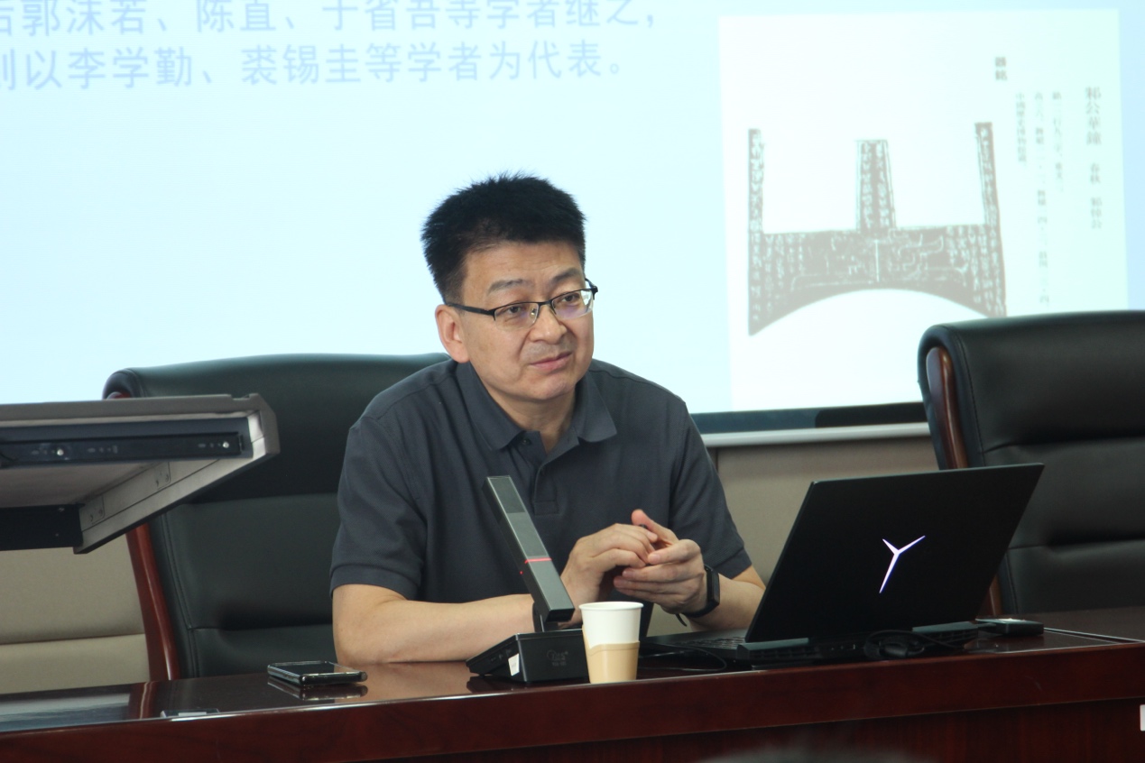 之后,韩高年教授详细介绍了出土文献的类型。出土文献主要包括图像文献、甲骨卜辞、金文文献、石刻文献、简帛文献和考古发掘的遗址遗迹等。韩教授对每种出土文献的具体类别、研究现状都进行了详尽说明,并辅之以大量的图像资料。韩教授特别将图像文献纳入出土文献,指出史前岩画是文字出现之前了解当时社会的珍贵史料;彩陶、铜器和玉器的纹饰描绘的场景与传世的文献记载亦能够互相印证。