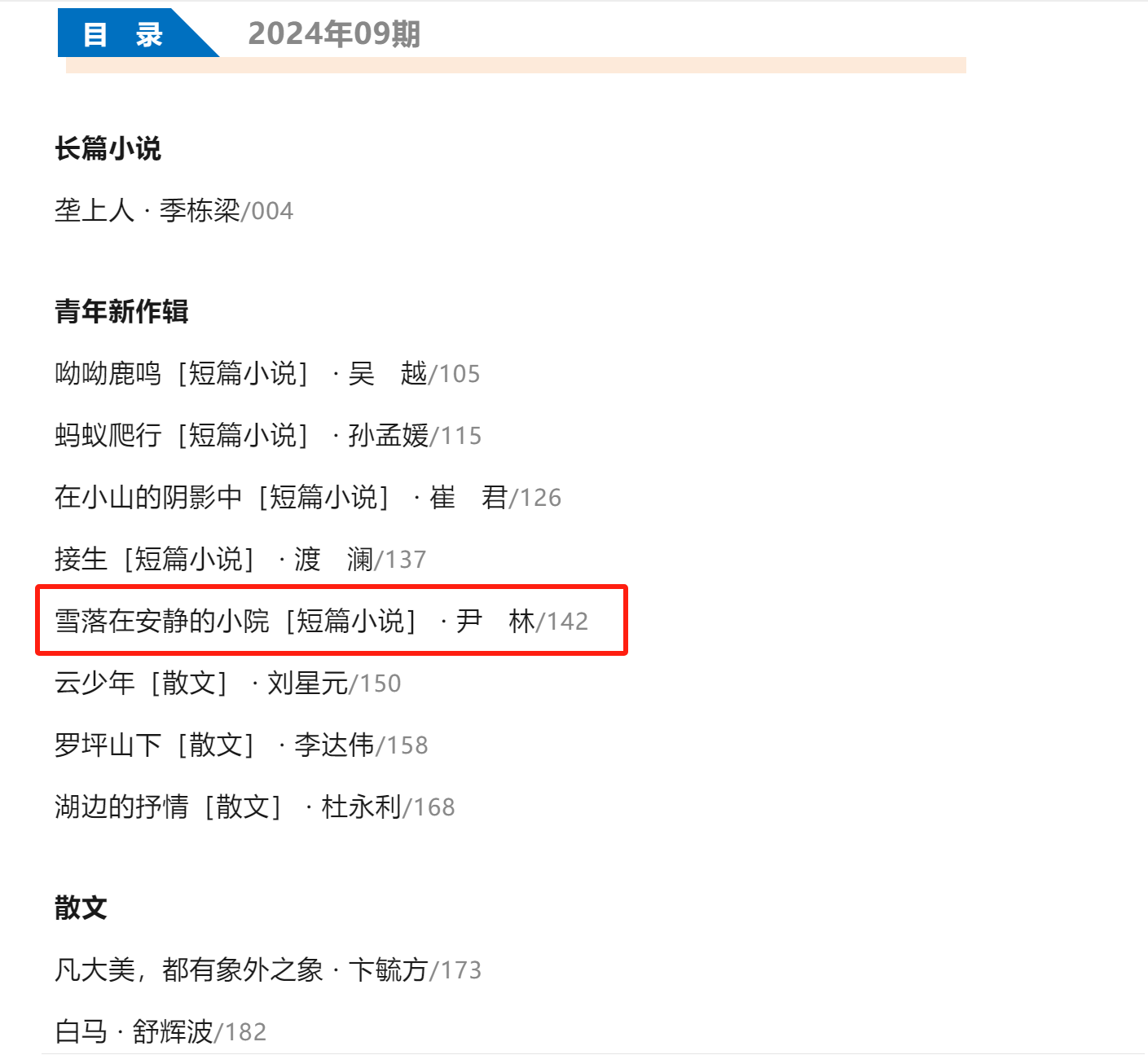 近日,《人民文学》“青年新作辑”栏目发表公司尹林研究员题为《雪落在安静的小院》的短篇小说。
