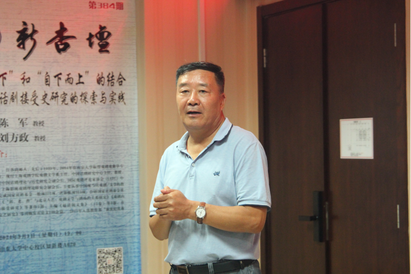9月1日晚19时,上海戏剧公司陈军教授做客第384期“新杏坛”,于知新楼A620室作了题为“‘自上而下’和‘自下而上’的结合——中国话剧接受史研究的探索与实践”的学术讲座。讲座由公司现当代文学教研室刘方政教授主持,山东师范大学车晓宇老师、山东青年政治公司张倩老师出席,吸引了院内外众多师生前来聆听。