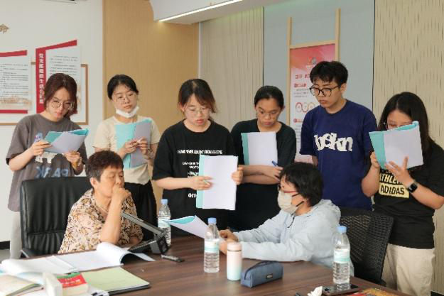 7月7、8、9日以及11日的上午,是课程最核心的方言调查部分。团队邀请了来自东村街道南才苑村的两位发音人,围绕海阳方言单字音系、单字记音以及及连读变调、轻声、儿化、“子”缀等方言现象展开了系统调研。调查过程中,师生围坐一堂,仔细聆听方言发音特点并使用音标符号加以记录。在调查过程中,当地的声调系统比较复杂,部分音节的声调调值仅存在细微的差异,团队成员反复听辨、多次确认,力争准确标注。每日调查结束后,团队同学在老师指导下及时整理数据,归纳音系特征与变调规则,逐步构建起海阳方言的语音系统框架。同时,同学们还在音系调查中深入了解了规范的方言调查程序,夯实了汉语方言学的听辨音技巧,提高了田野调查的实践能力。